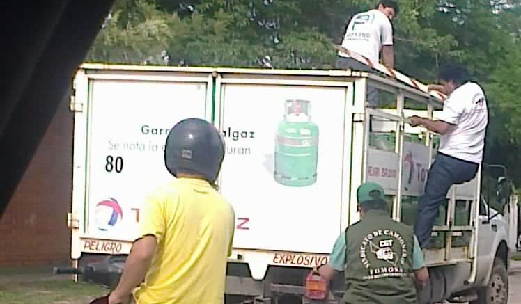 Desde su cuenta de Facebook, el periodista Miguel Gobio, asegura -acompañando con una fotografía- que el «Sindicato de Camioneros, reunidos en Circunvalación y González Lelong, vieron un camión de Total Gas trabajando. Lo corrieron en motos, lo alcanzaron, y le robaron. En la foto los chicos sobre el camión».