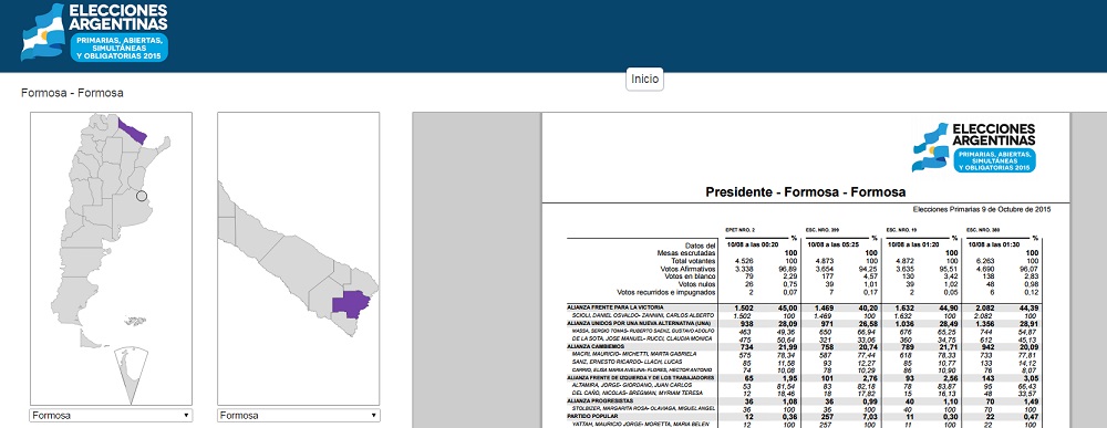 En una interesante muestra de transparencia, el sitio oficial de las Elecciones PASO (ver) ofrece acceder a los resultados por escuelas (ver) o por mesa (ver) mostrando la copia de fax recibido por la Cámara Electoral Nacional.
