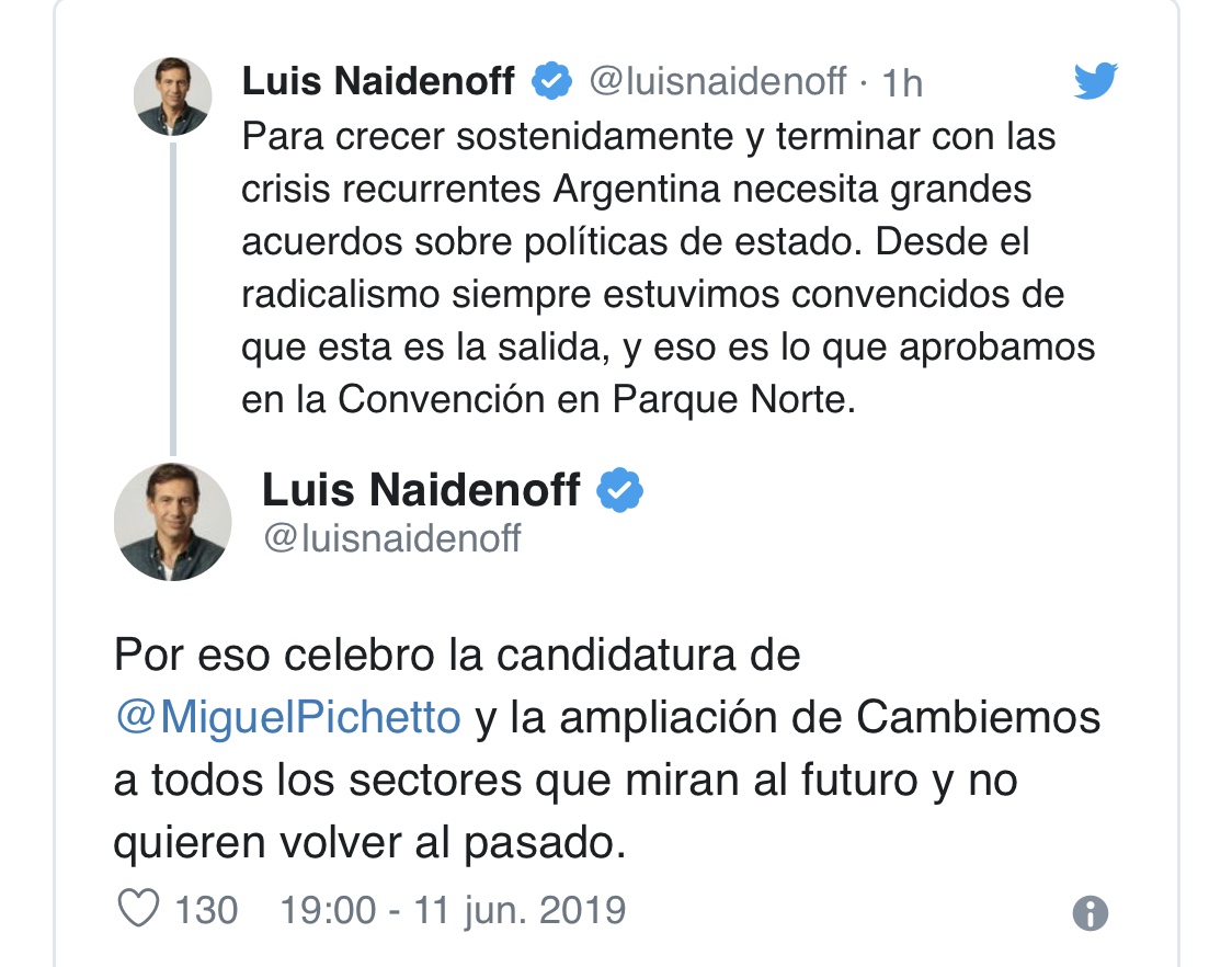 El senador nacional formoseño Luis Naidenoff celebró “la candidatura de @MiguelPichetto y la ampliación de Cambiemos a todos los sectores que miran al futuro y no quieren volver al pasado”. Las expresiones se conocieron desde la cuenta de Twiter del parlamentario.