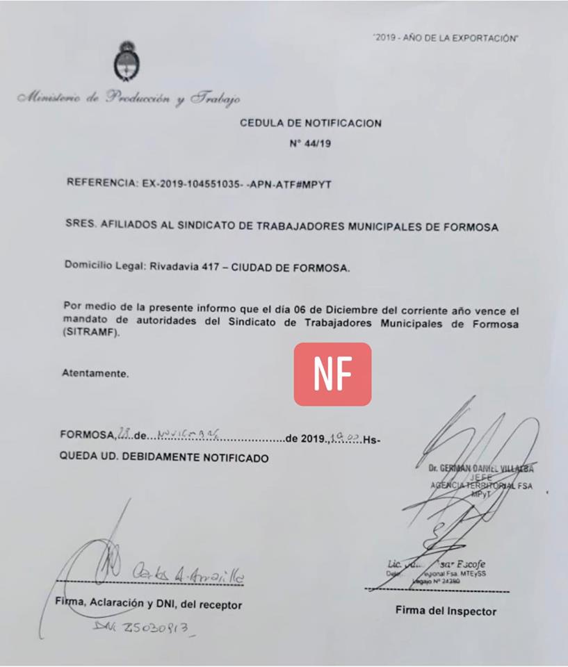 En medio del conflicto político-gremial-partidario de la gestión Jofré con «el quinto piso», el jefe de la Agencia Territorial del ministerio de Trabajo de la Nación-Formosa Germán Villalba, notificó a Jorge Luis Zarza.