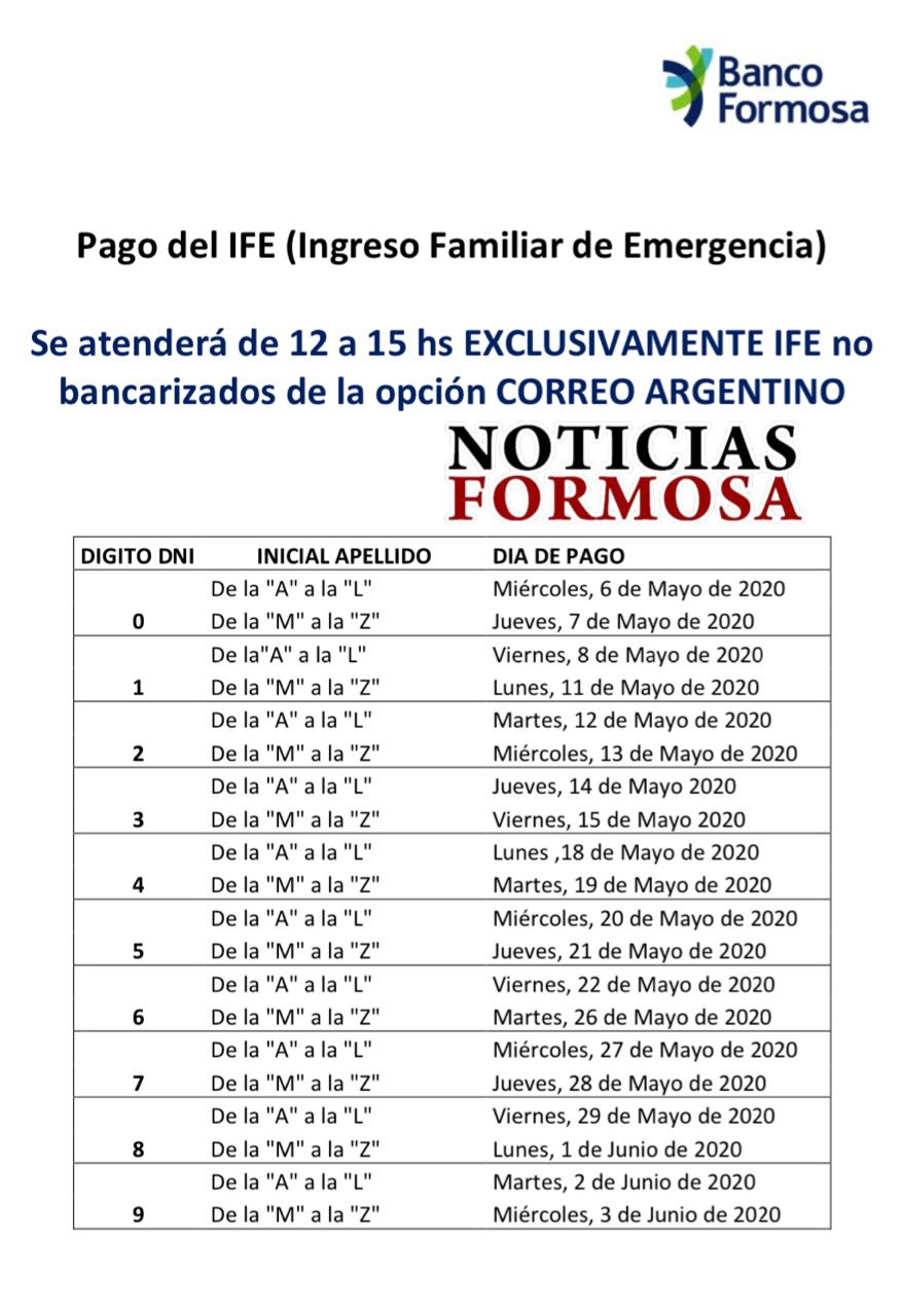 Desde el miércoles, por ventanilla, el Banco Formosa comenzará a abonar «los 10 mil pesos» a más de 42.000 beneficiarios del Ingreso Familiar de Emergencia (IFE) otorgados por la ANSES y que no tienen cuentas de caja de ahorro. Las fuentes indicaron a NF que «esto se logró por gestiones del gobernador (Insfrán)».