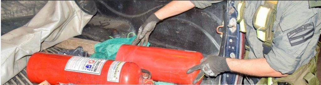 Durante la inspección efectuada en la parte trasera del rodado, los uniformados detectaron dos matafuegos envueltos con una red de color verde, observando a primera vista que los mismos presentaban uniones soldadas sobrepuestas, lo cual llamó la atención a los gendarmes.