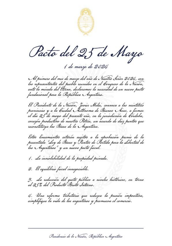 El Presidente de la Nación, Javier Milei, convoca a las veintitrés provincias y a la Ciudad Autónoma de Buenos Aires, a firmar el día 25 de mayo del presente año, en la jurisdicción de Córdoba, corazón productivo de nuestra Patria, un acuerdo de diez puntos que reconstituye las Bases de la Argentina.