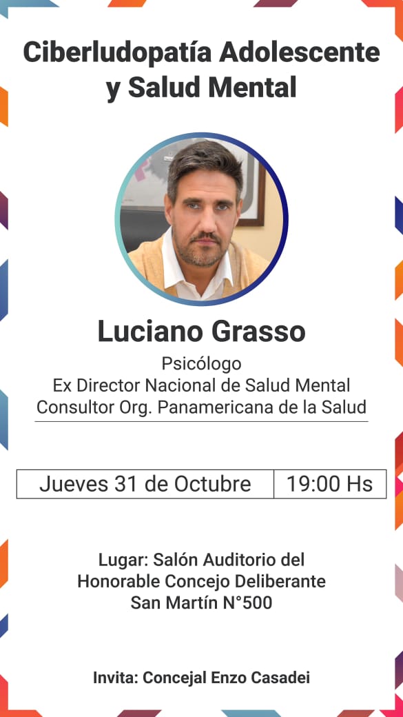 Luciano Grasso, reconocido psicólogo y consultor de la Organización Panamericana de la Salud, brindará una charla abierta y gratuita este jueves, en el auditorio del Concejo Deliberante – San Martin al 500- a partir de las 19hs.