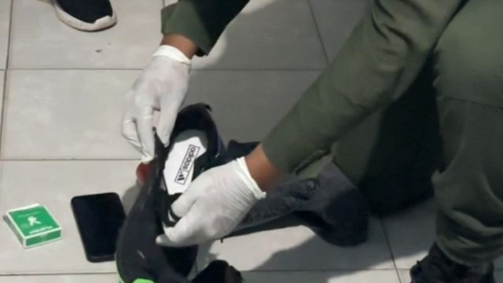 Al aperturar su mochila, los gendarmes hallaron un par de zapatillas en cuyo interior ocultaba un envoltorio de nylon color negro que contenía una sustancia blanca y polvorienta. Sometida a la prueba de campo narcotest, arrojó resultado positivo para clorhidrato de cocaína, un total de 100,7 gramos.
