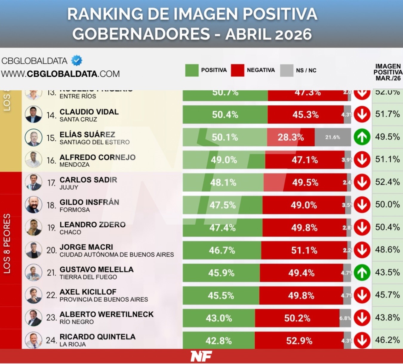 El informe además señala una caída en la imagen positiva respecto a marzo, cuando se ubicaba en 50,0%. En el ranking nacional de gobernadores elaborado por la consultora, Insfrán se posiciona en el puesto 18.
