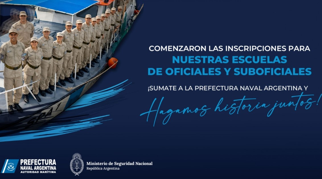 La Prefectura Naval Argentina comenzó hoy la inscripción a sus Escuelas de Oficiales y Suboficiales para los jóvenes, de ambos sexos, que quieran desarrollar su carrera profesional dentro del equipo de la Autoridad Marítima argentina, pudiendo acceder a un título universitario (tras una pasantía en el campo de estudio) o una tecnicatura.