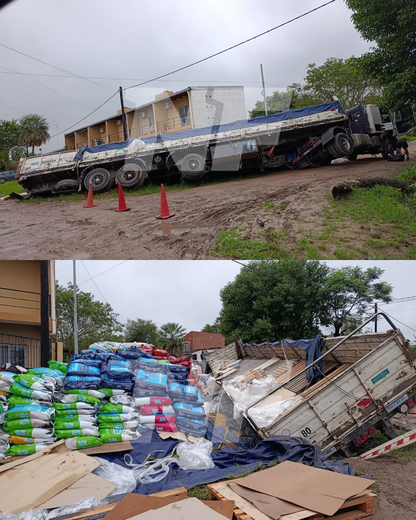 Comenzó el operativo para retirar el camión con semi acoplado que volcó en la noche de este martes en una zanja en el barrio Sagrado Corazón. Para poder avanzar con las tareas, fue necesario descargar toda la mercadería que transportaba, compuesta por alimento balanceado para perros y gatos.