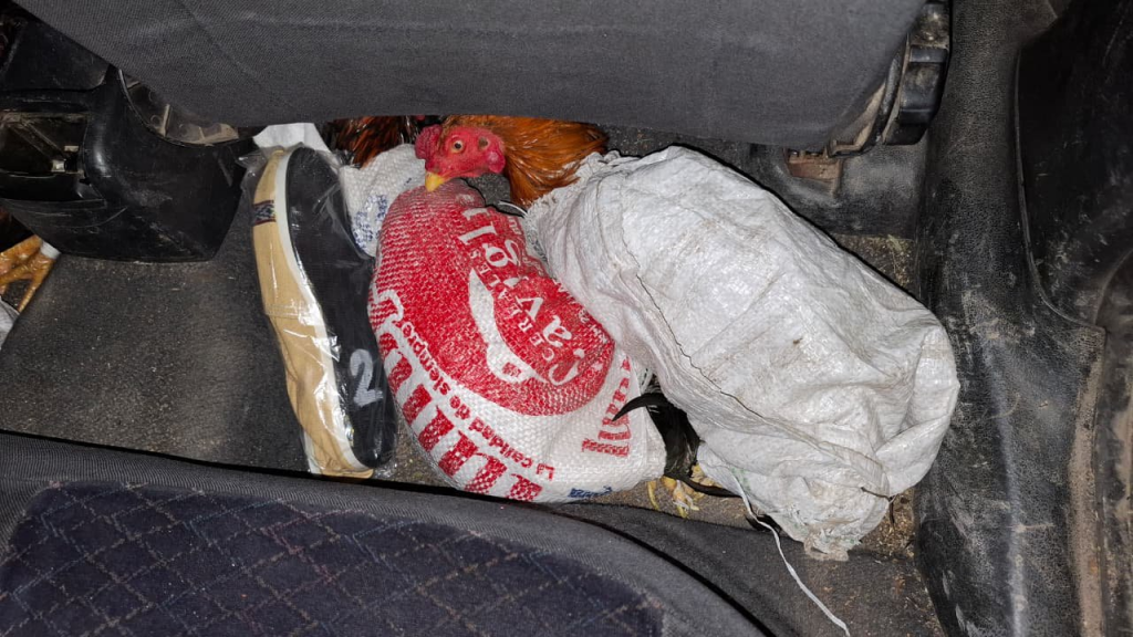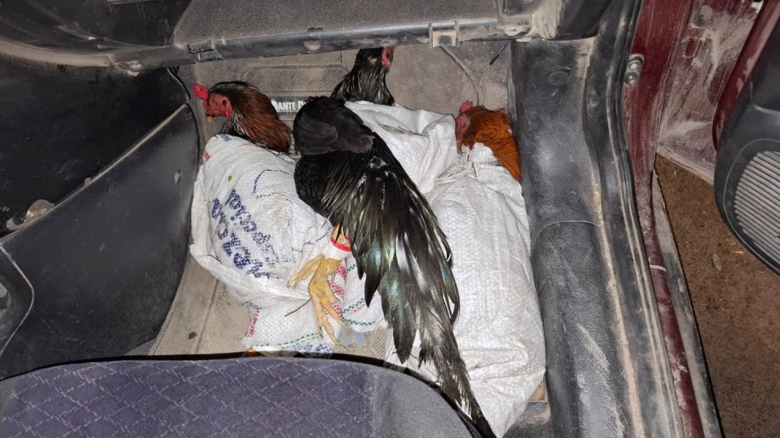 Inmediatamente, se intensificó la requisa hallando en dichos bultos ocho gallos atados destinados a la riña. Además, los gendarmes constataron en la guantera un frasco con 16 puntas metálicas las cuales son utilizadas en los animales para las peleas ilegales.