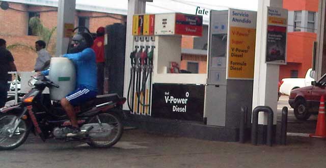 En la estación de servicio de la avenida 9 de Julio y J. J. Silva se observaron hoy miércoles, motociclistas o “gente que llega caminando” que le permiten cargar bidones de 5 y 20 litros, a pesar de la prohibición de Defensa al Consumidor en medio de la crisis por falta de combustible que afecta a propietarios de vehículos.