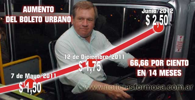 Desde 7 de mayo del 2011, el boleto urbano de pasajeros en la ciudad de Formosa pasaba a costar de $ 1,50  a $ 1.75; mientras que el escolar costaría $ 0.75. El 12 de diciembre  del mismo año, unos 7 meses atrás, el aumento llegó a los $ 2, y el trasbordo 2.50. El boleto escolar: “un sol”: $1.